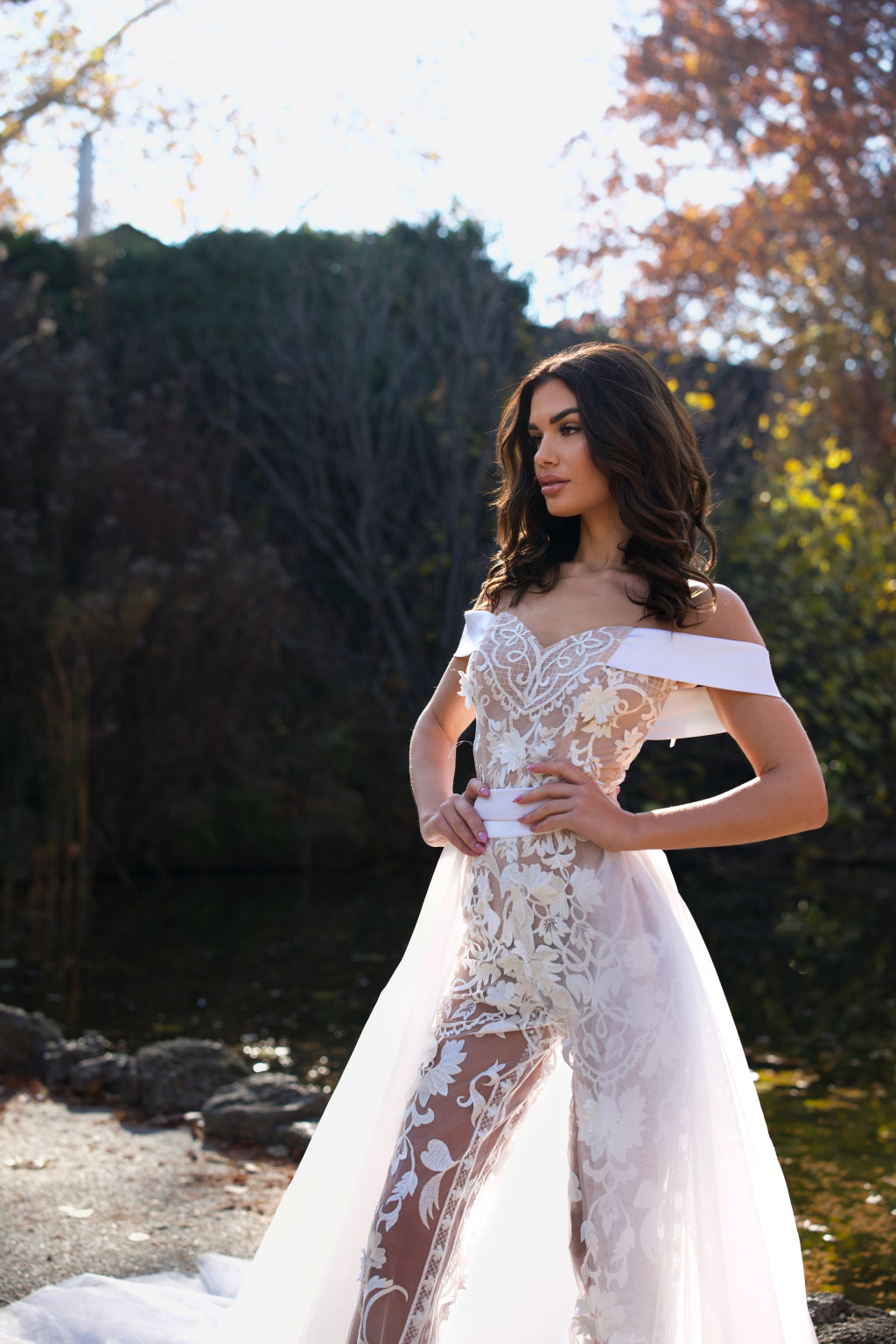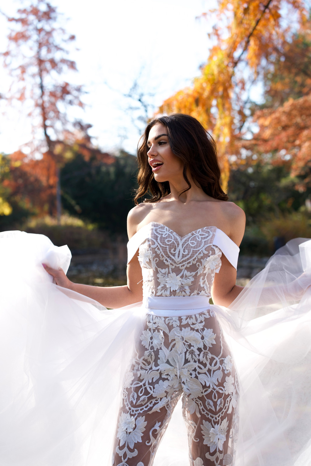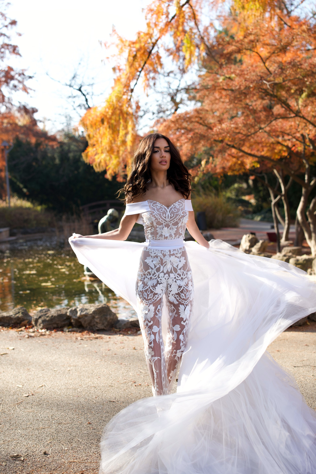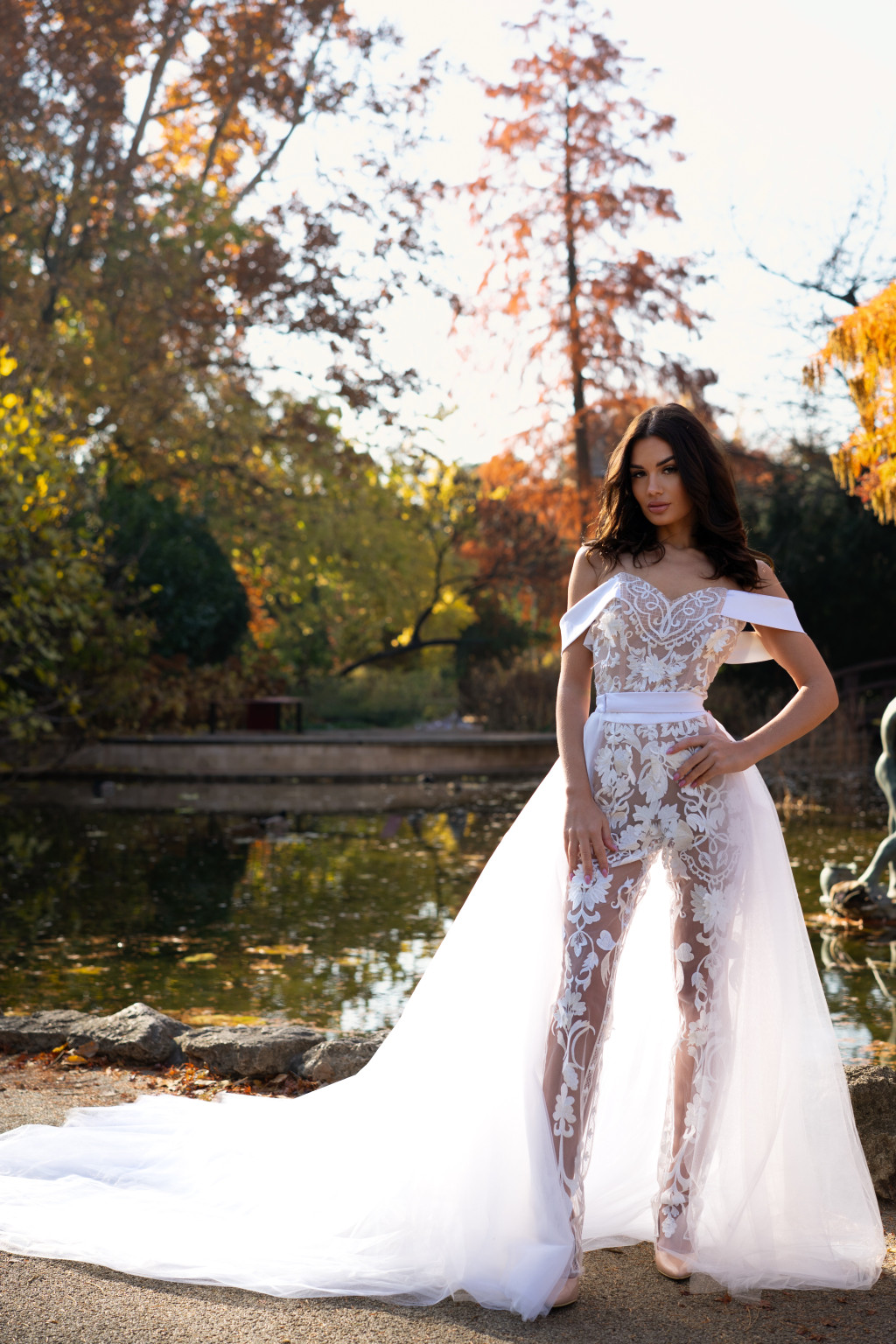 Francia csipkéből készült egyrészes esküvőiruha , levehető tüll szoknyarésszel .